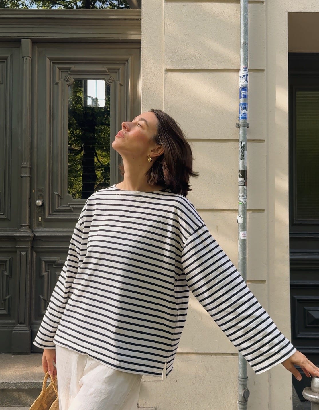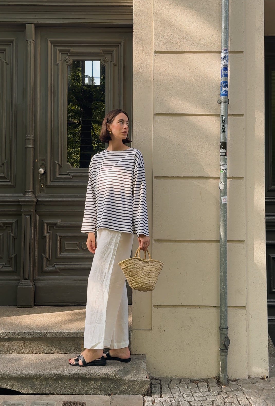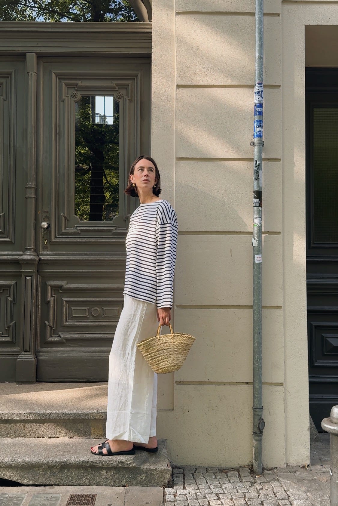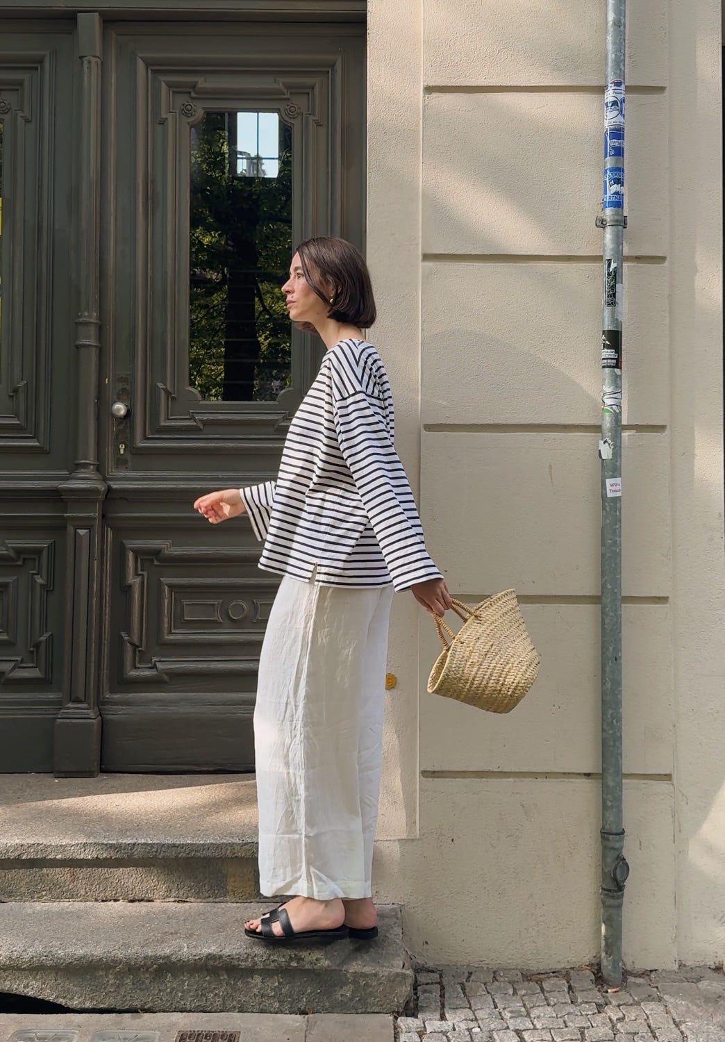 WORE old linen trousers (similar ones here), a Breton shirt by Arket, Hermès sandals, earrings by Lie Studio, and a basket from our local market (find similar version on Etsy here and here.)