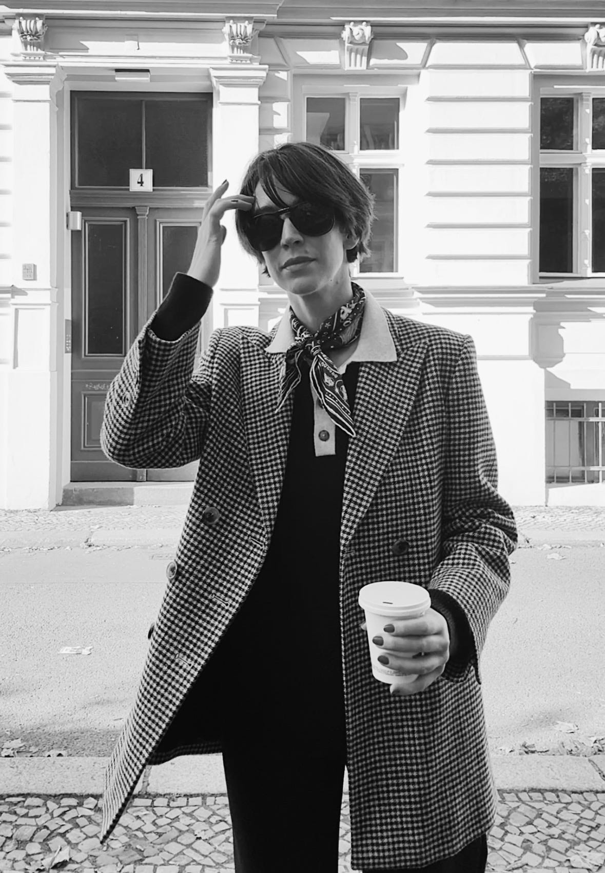 WORE an old blazer by Alexa Chung’s label. The label no longer exists, but & Other Stories and Mango have a pretty similar ones at the moment. My rugby-inspired sweater is by Sézane, as are the trousers, though you can only partly see them. The sunnies are Persol, and the silk bandana is by Hermès (similar pre-loved version here).