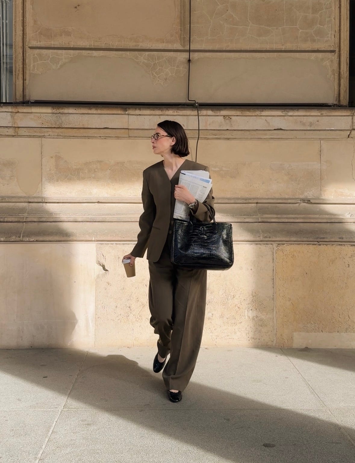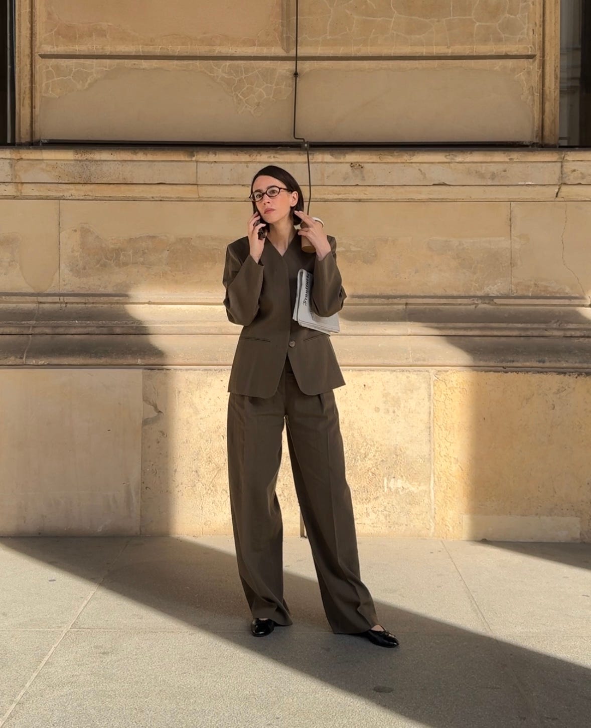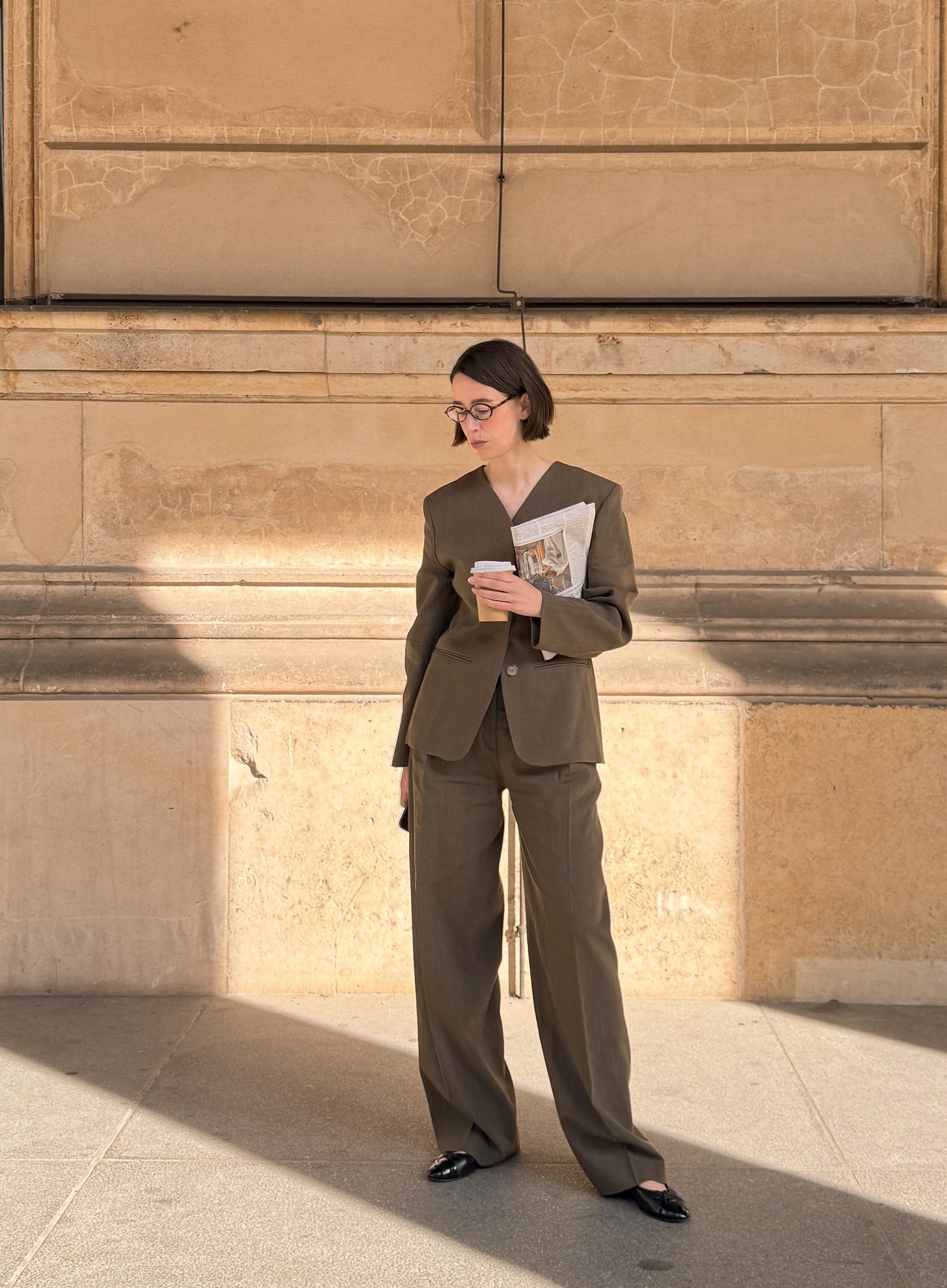 WORE this fabulous linen suit (jacket here and trousers here), a trusty old Lonchamp bag, Chanel ballerinas, and Miu Miu glasses. A perfect business look, but make it cool!