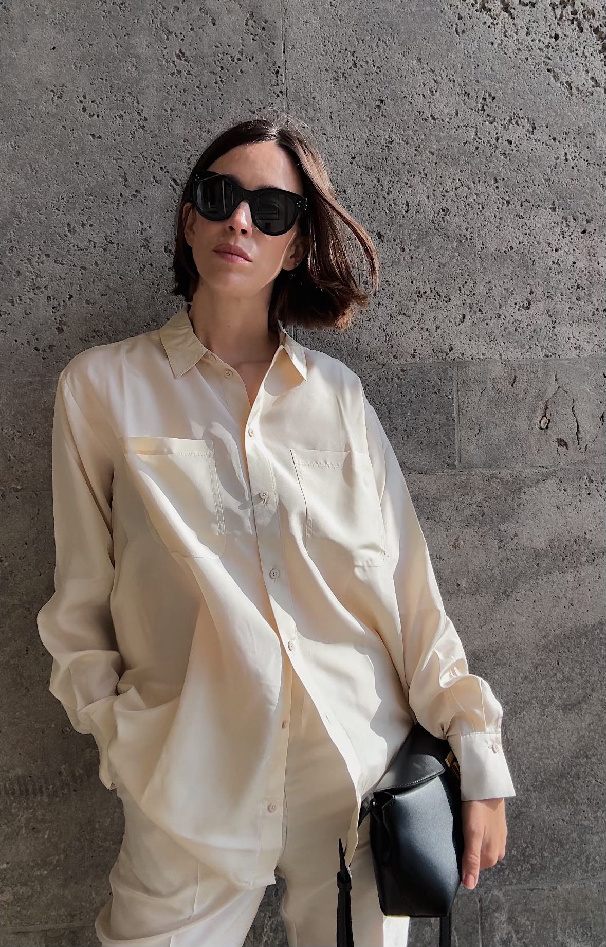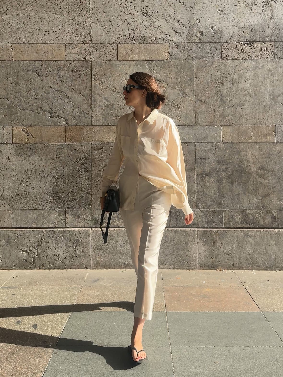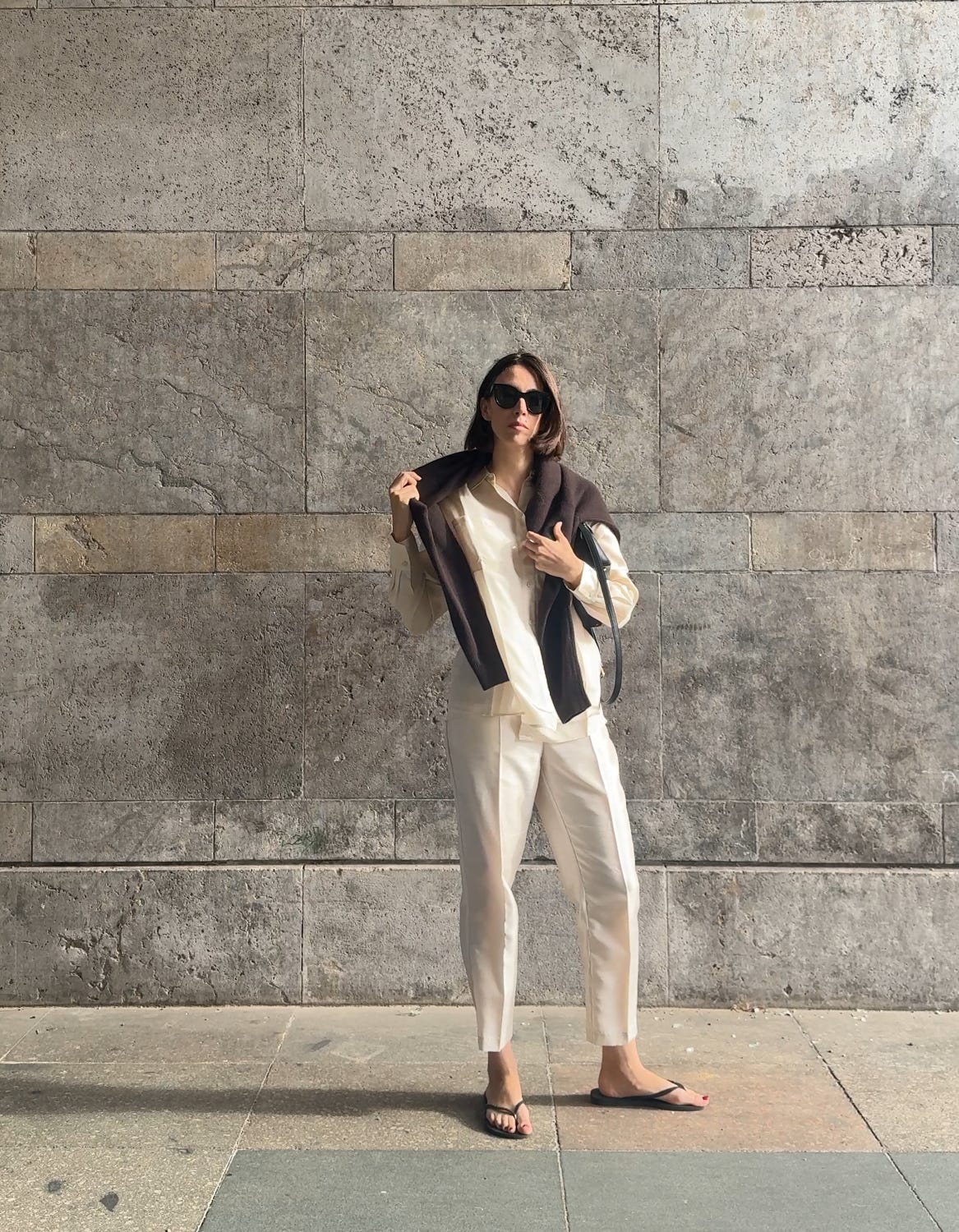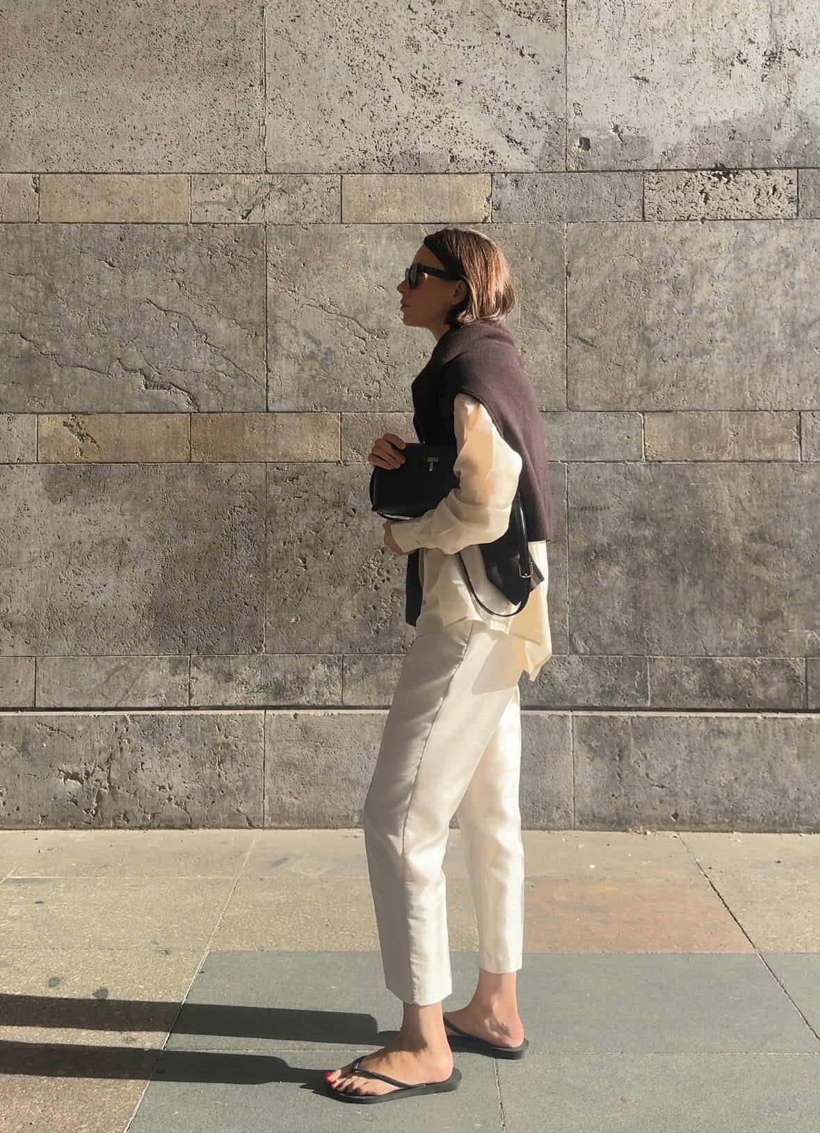 WORE old silk trousers (similar here), a Sézane silk shirt, Havaianas flip-flops, my Toteme T-lock bag, and Céline sunglasses (on sale!). Also snuck in a chocolate-brown cashmere sweater from COS (men’s section) – the it colour for autumn.