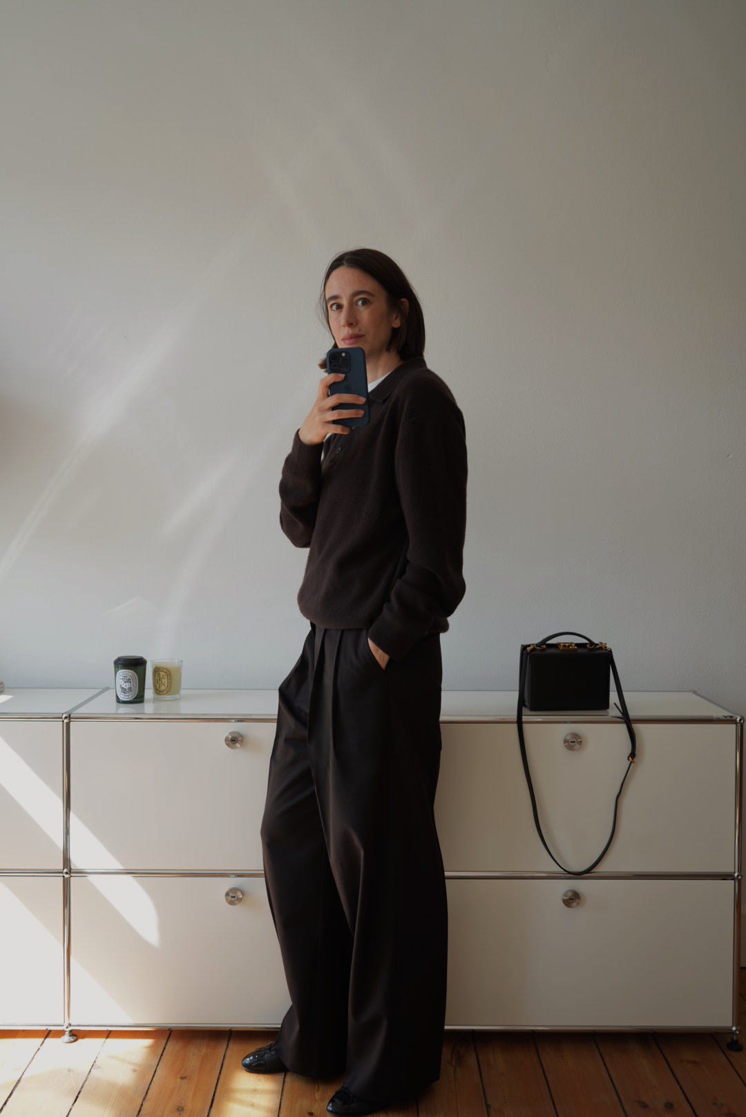 WORE my beloved COS sweater from the men’s section, COS trousers in chocolate brown, Chanel ballet flats, my Mark Cross – and hair that’s desperately in need of a cut.